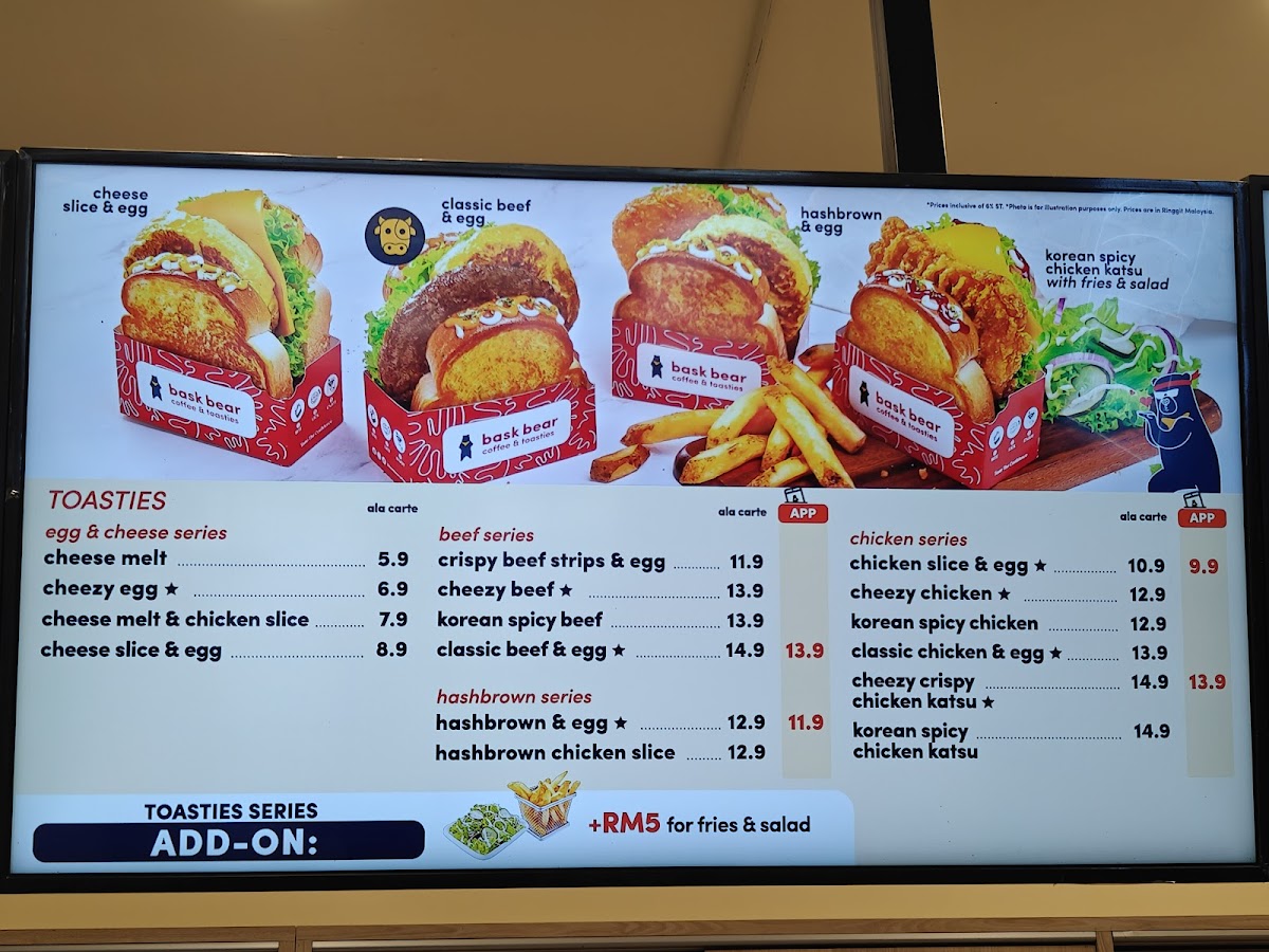 The menu at Bask Bear Coffee Bentong Pahang features a variety of beverages and food items suitable for casual dining and light meals. The offerings are organized into distinct categories to cater to different preferences throughout the day, including coffee breaks and quick bites.